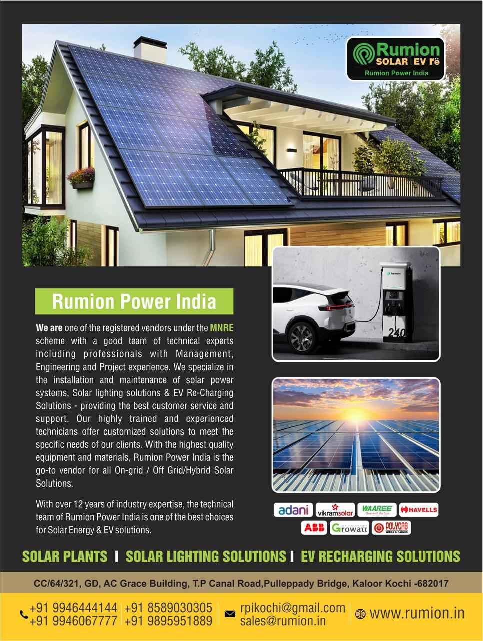 Posted on sascha namithaTrustindex verifies that the original source of the review is Google. We installed solar panels on our villa compound, Skyline Crystal Waters, and it been really useful. The company has installed and handled the setup and maintenance with utmost care, making the whole process easy for us.Posted on Anish vargheseTrustindex verifies that the original source of the review is Google. Very nice dealing and very much transperent in all stages and billing of solar plant installation. Even though I'm not available in location, couldn't face issues and this company take care of everything including the connected load corection and 3 phase conversion under very minimal cost Also for bank loan formalities, they will take of everything I'm very satisfied with the services and advices providedPosted on AFZAL SHIHABTrustindex verifies that the original source of the review is Google. I recently installed a solar power system at my home through Rumion Power, and I am extremely satisfied with their service. From the first conversation to the final installation, their team was professional, knowledgeable, and very supportive. They clearly explained the system requirements, guided me in choosing the right capacity, and handled the entire process smoothly. The installation was neat, timely, and done with great attention to detail. After switching to solar, my electricity bills have reduced significantly, and the system is working perfectly. Rumion Power truly stands out for their quality products, excellent customer service, and reliable after-support. I confidently recommend them to anyone looking to install solar power at their home. Great job, Rumion PowerPosted on Justin JoseTrustindex verifies that the original source of the review is Google. I had a 9 KVA (3x3) solar plant installed at my home by Rumion, and I’m very happy with their work. The installation was done smoothly and professionally. Their after‑sales service and support have been excellent — they handled the hurdles created by the DISCOM very efficiently and kept me updated throughout the process. What impressed me most is that they always stayed in touch and patiently addressed all my doubts. Overall, Rumion has provided reliable service and strong customer support, and I highly recommend them for solar installations.Posted on krishna kumarTrustindex verifies that the original source of the review is Google. I had installed solar panel through Rumion Power India. Good experience. They installed Solar Panel in a professional way and teach us how to maintain it. I am very happy with this solar panel view no current bills am paying post installation of this solar panel. Thanks to Rumion Power India.Posted on Clint JoyTrustindex verifies that the original source of the review is Google. I recently had a solar powered system installed by Rumion Power, and I’m extremely happy with the overall experience. They recommended and installed a dual-channel Growatt inverter, and it has been performing flawlessly. The dual MPPT setup really helps optimise power generation. The team was knowledgeable, punctual, and transparent throughout the entire process—from design to installation to final commissioning. They handled all the paperwork and meter-related formalities, making the transition to solar completely stress-free. The system is delivering the expected output, and the monitoring app makes it easy to track real-time performance. I highly recommend Rumion Power to anyone looking for a reliable and professional solar provider.Posted on JOHN CHACKOTrustindex verifies that the original source of the review is Google. Good experience. They teach us about what they are going to install. Good knowlage. Full service ,they did all the form filling and the KSCB hassle. To me its was like plug and play , told them my needs the calculated the power consumption and recomented a 5kw solar plant. The cost and all sounded ok . Now all set and our frist second and third bill now is 0. Will recommend to any who asks..Posted on Jithin K RoyTrustindex verifies that the original source of the review is Google. Had a great experience with Rumion Power! Their team guided me well in choosing the right solar solution and the installation was smooth and professional. The system is working perfectly, and I’m already seeing the benefits in my electricity bills. Highly recommend them for anyone looking to switch to solar!Posted on Sreejit KumarTrustindex verifies that the original source of the review is Google. Great experience, qualified technician and any time service support. Highly recommended. Best solar installation service in kochi